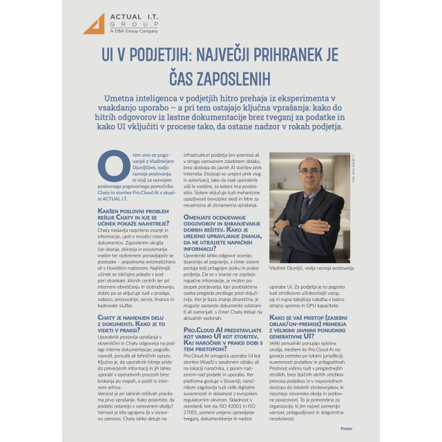 Artificial intelligence in companies is rapidly moving from experimentation to everyday use. At the same time, key questions remain: how to get quick answers from internal documentation without putting data at risk, and how to integrate AI into processes while keeping control firmly in the company’s hands. The editorial team of Podjetna Slovenija discussed these topics with Vladimir Djurdjič, Head of Business Development, who is behind the development of the Chaty business conversational assistant and Pro.Cloud AI services within the ACTUAL I.T. group. Welcome and enjoy reading!